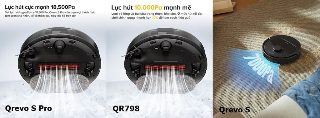 Trong ba sản phẩm, Roborock Qrevo S Pro có lực hút mạnh nhất với 18.500 Pa, giúp làm sạch tốt bụi mịn, tóc và lông thú cưng trên thảm. QR798 có lực hút ở mức trung bình 10.000Pa , còn Qrevo S có lực hút 7.000Pa, phù hợp cho nhu cầu vệ sinh cơ bản.