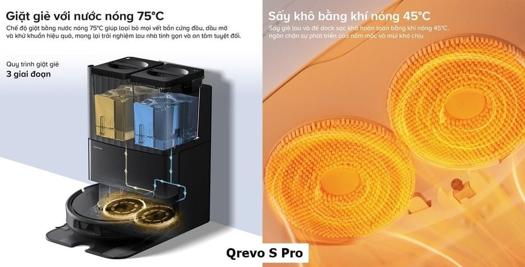 - Qrevo S Pro nổi bật hơn khi tự động giặt giẻ bằng nước nóng lên đến 75°C, kết hợp quy trình giặt ba giai đoạn giúp loại bỏ dầu mỡ và vết bẩn cứng đầu hiệu quả hơn so với hai model còn lại. Sau khi giặt, giẻ lau tiếp tục được sấy khô bằng luồng khí nóng 45°C, giúp hạn chế nấm mốc và giữ giẻ luôn khô ráo.