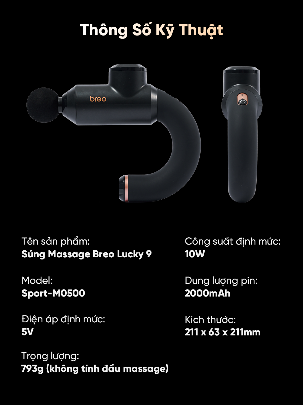 Breo Lucky 9 là súng massage giãn cơ chuyên sâu, kết hợp công nghệ massage tiên tiến và chườm nóng tức thì, giúp giảm đau nhanh chóng, thư giãn cơ bắp và hỗ trợ phục hồi hiệu quả sau tập luyện. Với 4 cấp độ tùy chỉnh, biên độ 12mm, lực đẩy 19kg và 6 đầu massage chuyên biệt, sản phẩm mang đến trải nghiệm massage mạnh mẽ, linh hoạt, phù hợp với mọi nhu cầu giãn cơ.